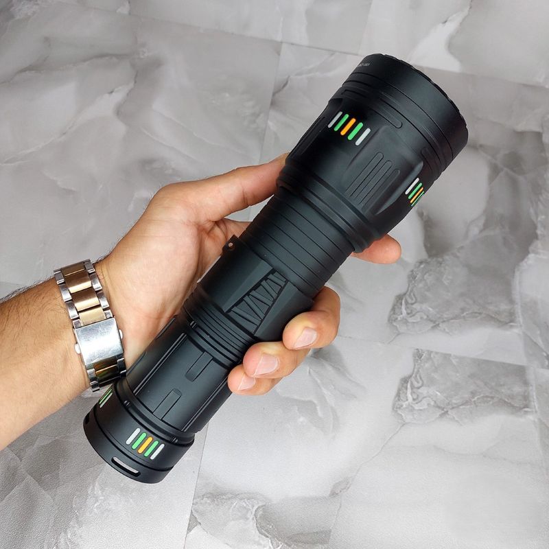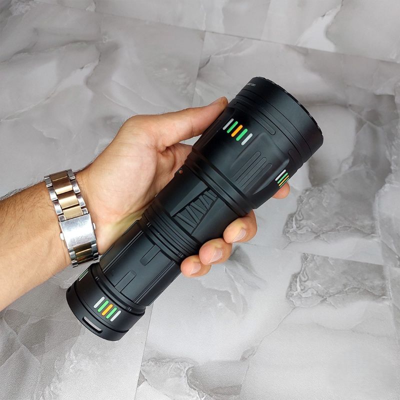 وزن 662 گرم این چراغ قوه حرفهای، توازن مناسبی بین قدرت و قابلیت حمل ایجاد کرده است. ابعاد محاسبهشده 6.5 در 20.5 سانتیمتر، جایگیری آسان در کولهپشتی یا جیب بزرگ را ممکن میسازد. سیستم ضد لغزش روی سطح بدنه، کنترل مطمئن حتی در شرایط مرطوب را فراهم میآورد.